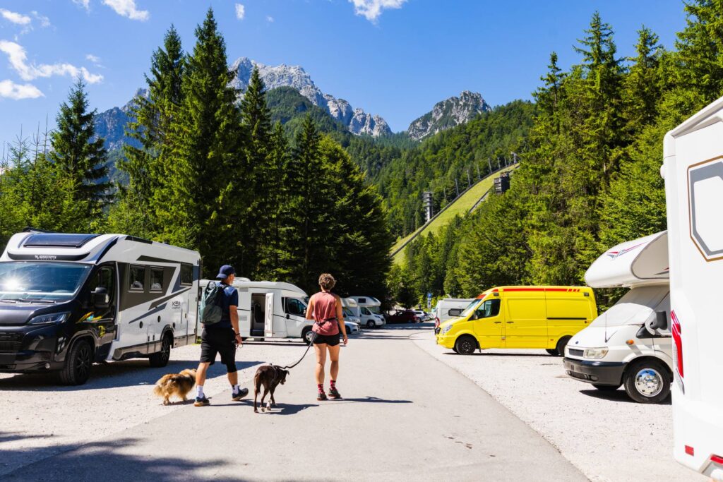 Če se v Planico pripeljete z avtodomom, so vam na voljo urejena parkirišča za avtodome s komunalnimi stebrički (elektrika, voda in izliv odpadnih voda).