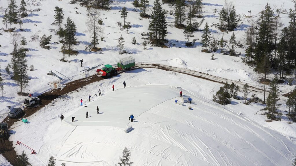 Vsako zimo se v Planici pripravi in shrani približno od 15.000 do 25.000 m³ snega. Ob koncu sezone se sneg prekrije z več plastmi zaščitnega filca, ki deluje kot izolacija ter zmanjšuje taljenje v poletnih mesecih. Izolacijski sloji filca preprečujejo neposredno izpostavljenost soncu in toploti ter omogočajo, da velika količina snega ostane uporabna do jeseni.